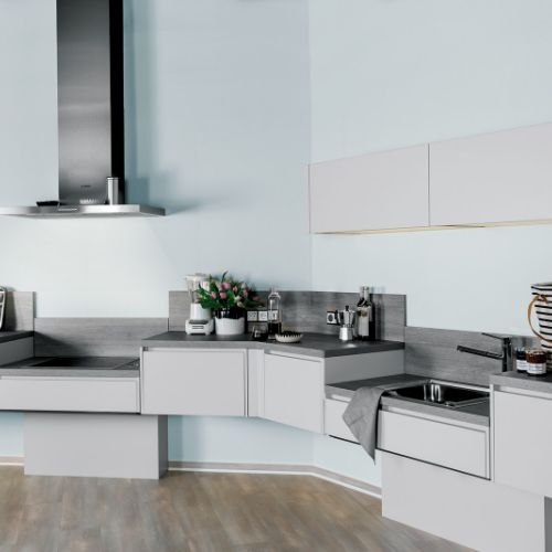 Révisez les possibilités d´organisation de votre cuisine actuelle, peu importe s´il s´agit d´une cuisine réduite ou d´un large espace pour une famille entière, ou même une conception exclusive avec des points culminants, tout est possible, cela avec un maximum d'individualité, un design hors du commun combinés à des détails d'équipement intelligents.